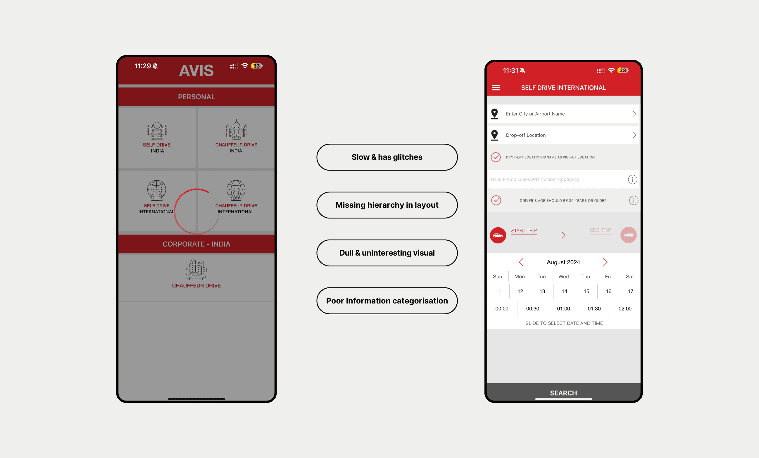 Despite being a recognised brand, the Avis India app struggled with several UX/UI issues that hindered user satisfaction and retention.