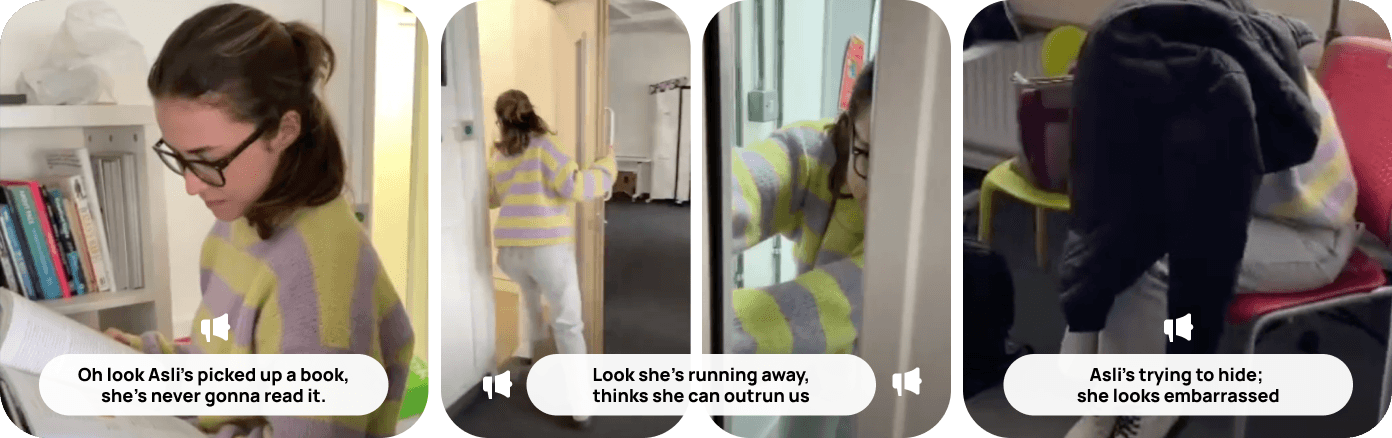 For example, when Asli (a team member) picked up a book, I narrated: "I’m picking up a book… I’m never going to read it."