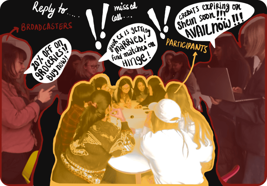 This LARP investigates the concept of a sound deadzone by reimagining it as a space saturated with relentless digital noise: aggressive notifications, constant prompts, and sensory overwhelm.