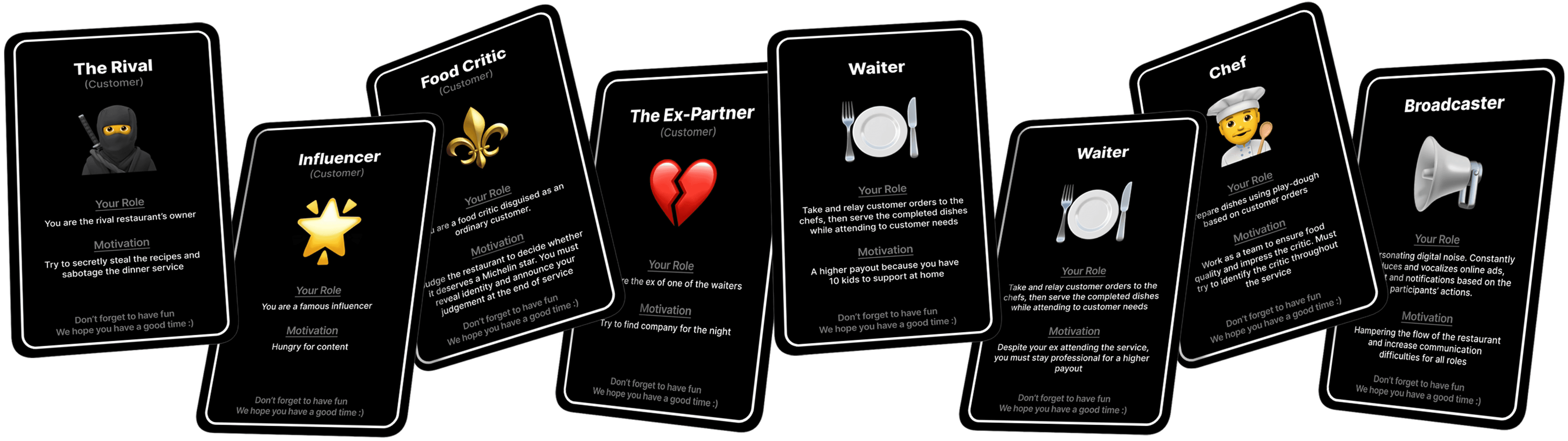 Each group- customers, waiters, and chefs- had a main mission, but customers & waiters also got fun identity cards. This helped them dive deeper into their roles & stay in character.