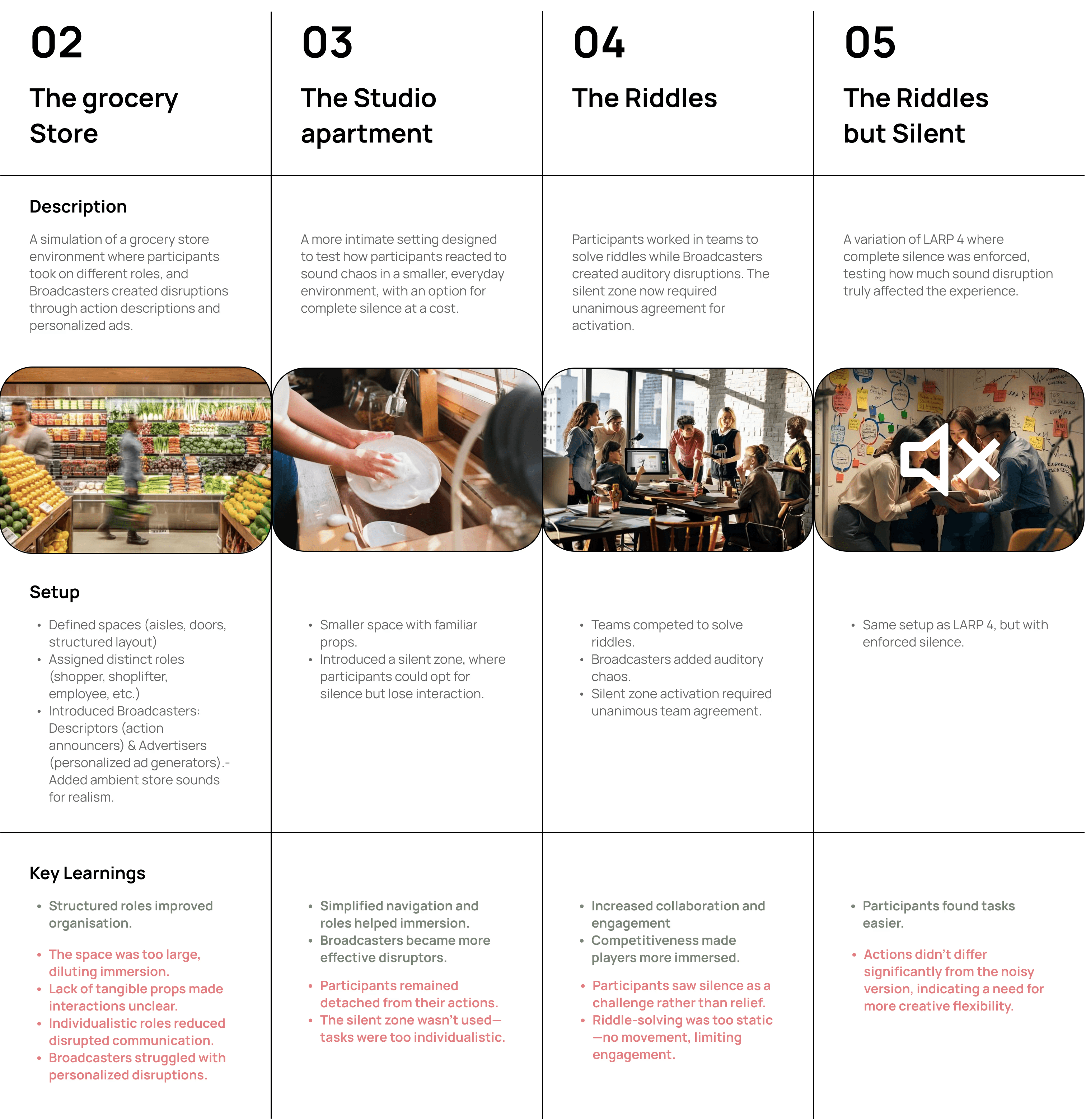 With our world and outline in place, we began rapid prototyping scenarios- adapting and iterating with each run to explore different aspects of the LARP. The table below outlines each iteration, how it was set up, and the key insights gained.