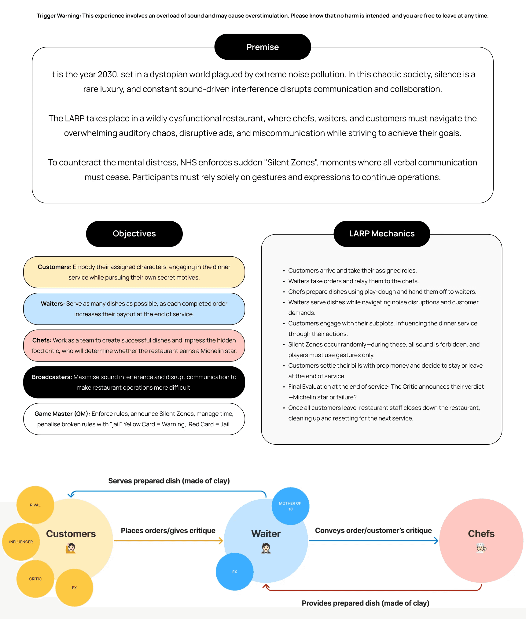 From these LARP runs, the basis of our final outline was formed. We called these our 'grounding principles'- guides that ensured the final LARP stayed in tune with our goal and design enquiry.