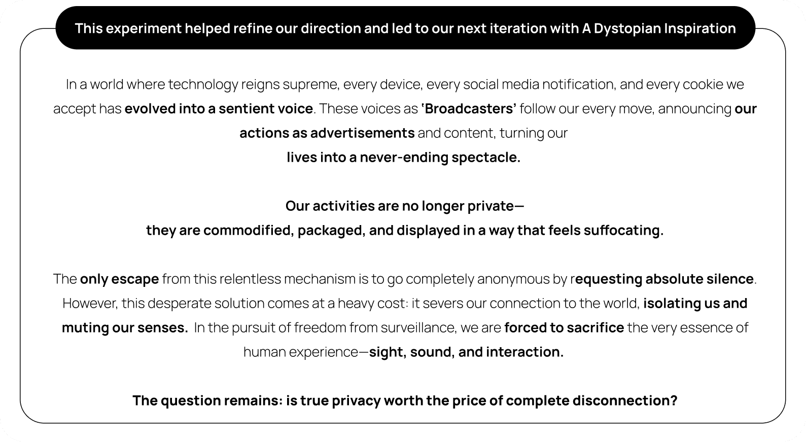 Designed to provoke reflection on our hyper-connected reality, the experience challenges participants to question the future of silence, attention, and digital intrusion.