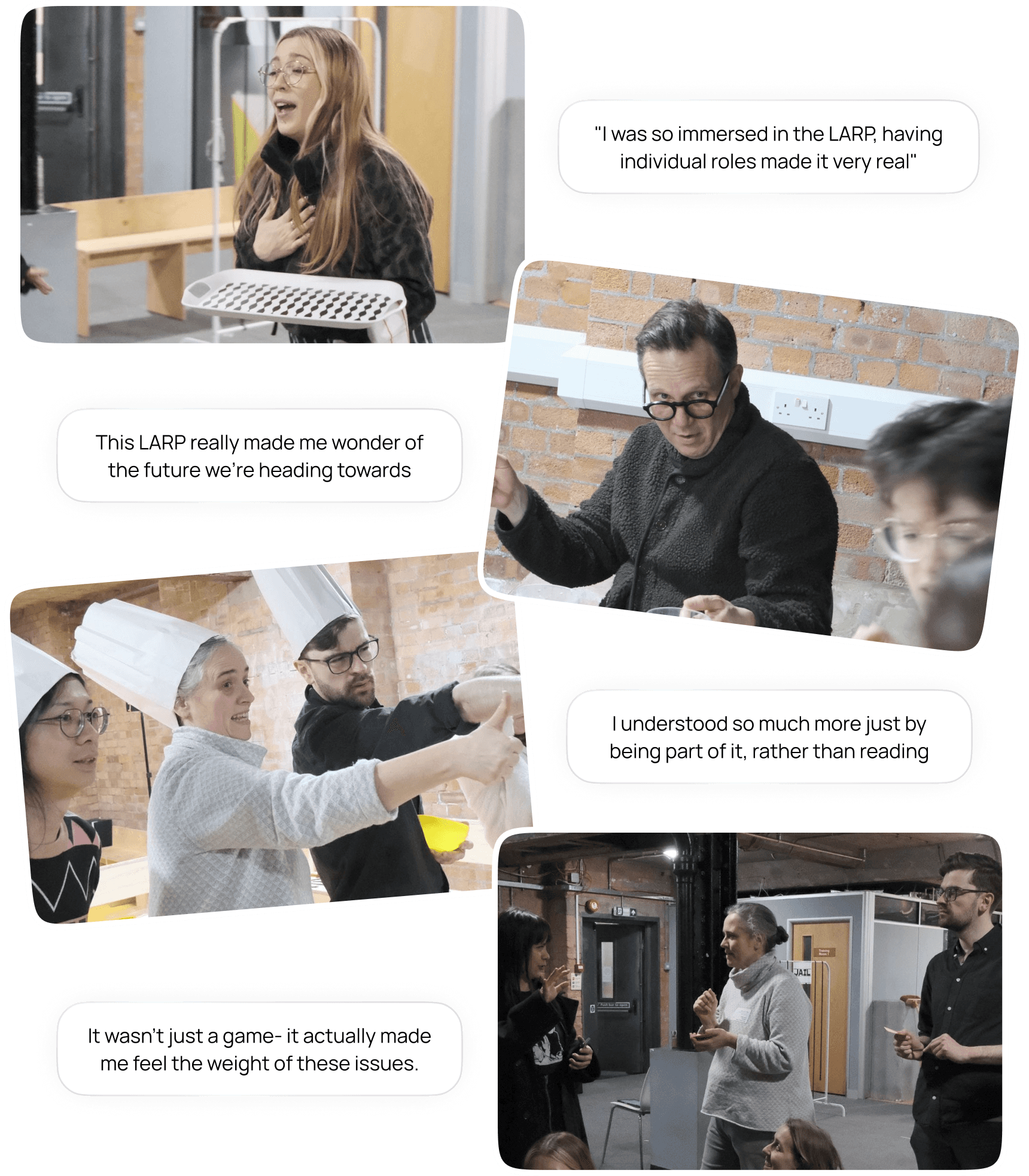 The LARP workflow, outlining individual roles. The images are snapshots from the LARP run, colour-coded to correspond with the related workflow elements.