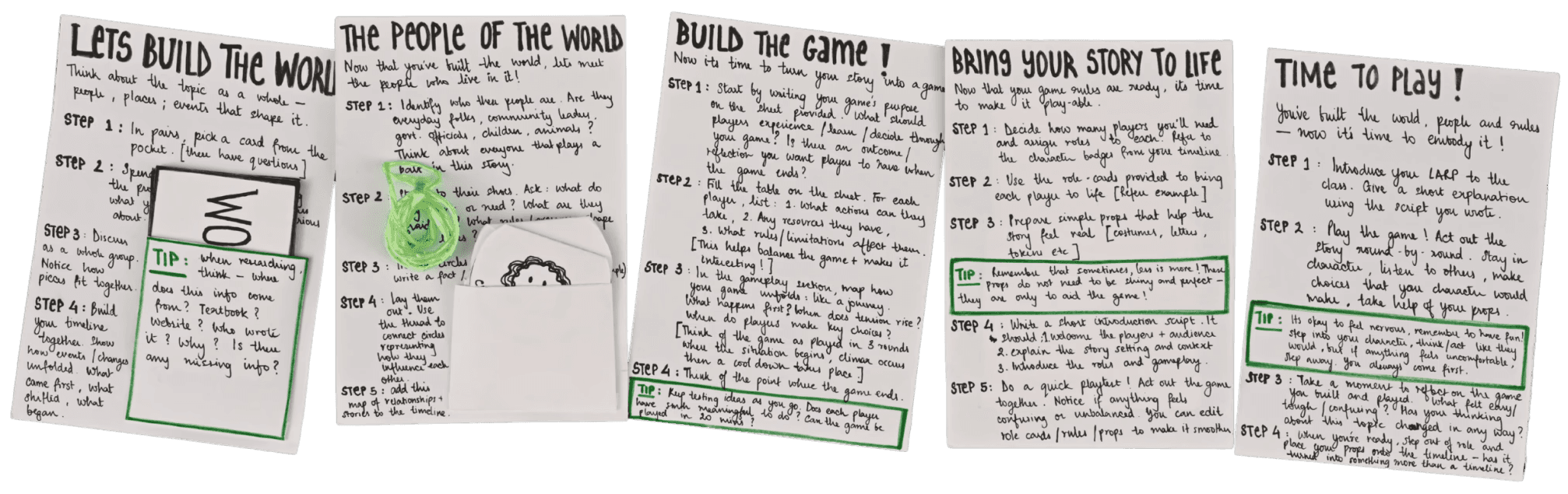 This was the first time the idea stood on its own two feet. The low-fidelity prototype consisted of five stages, each on its own page. These stages directly mirrored the LARP structure shown earlier- from building the world, to performing within it, to reflecting afterwards. Armed with this guide, we facilitated a two-hour LARP session where participants designed and performed around the topic of the Windrush scandal.