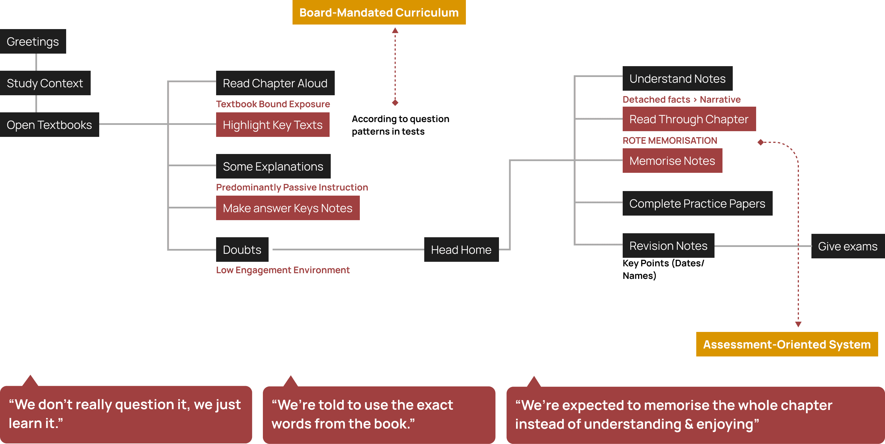 To begin understanding our users, we first had to understand the ecosystem they operate within. Here is a mapped student journey capturing a typical week of their interaction with history lessons. The red markers indicate key pain points, which are later translated into the personas presented next. All insights shown here are derived from credible secondary research and primary research conducted during this project.