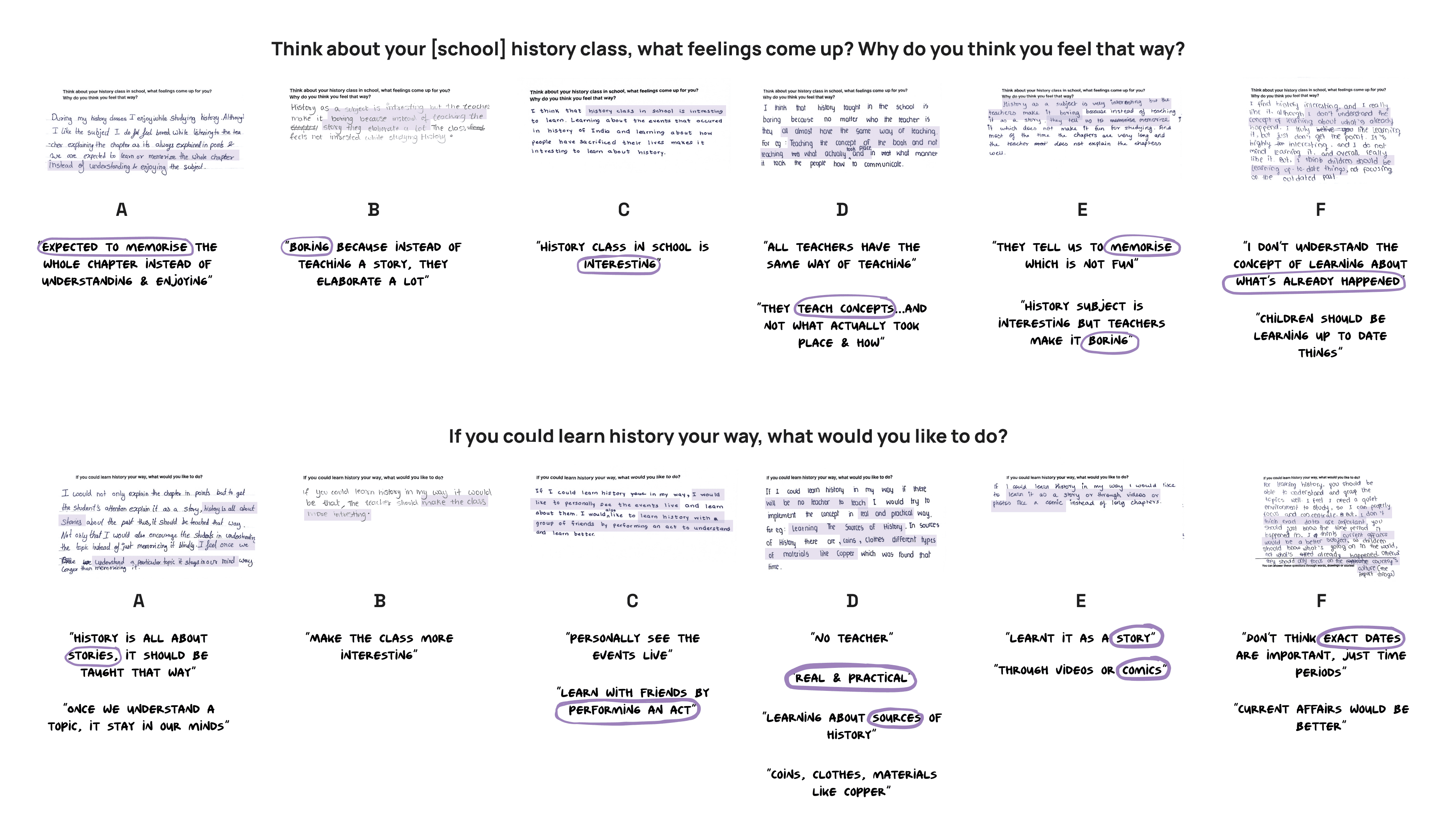 This project uses rigorous user research to transform static, rote-memorisation–driven history lessons into immersive experiences of role-play and world-building. The best part? It works within the real constraints of schools- tight timetables, heavy syllabi, limited teacher bandwidth, and rigid board requirements. Instead of adding more, it simply shifts agency to students- enabling them to participate, embody, enjoy, and think about history in ways they never have before.