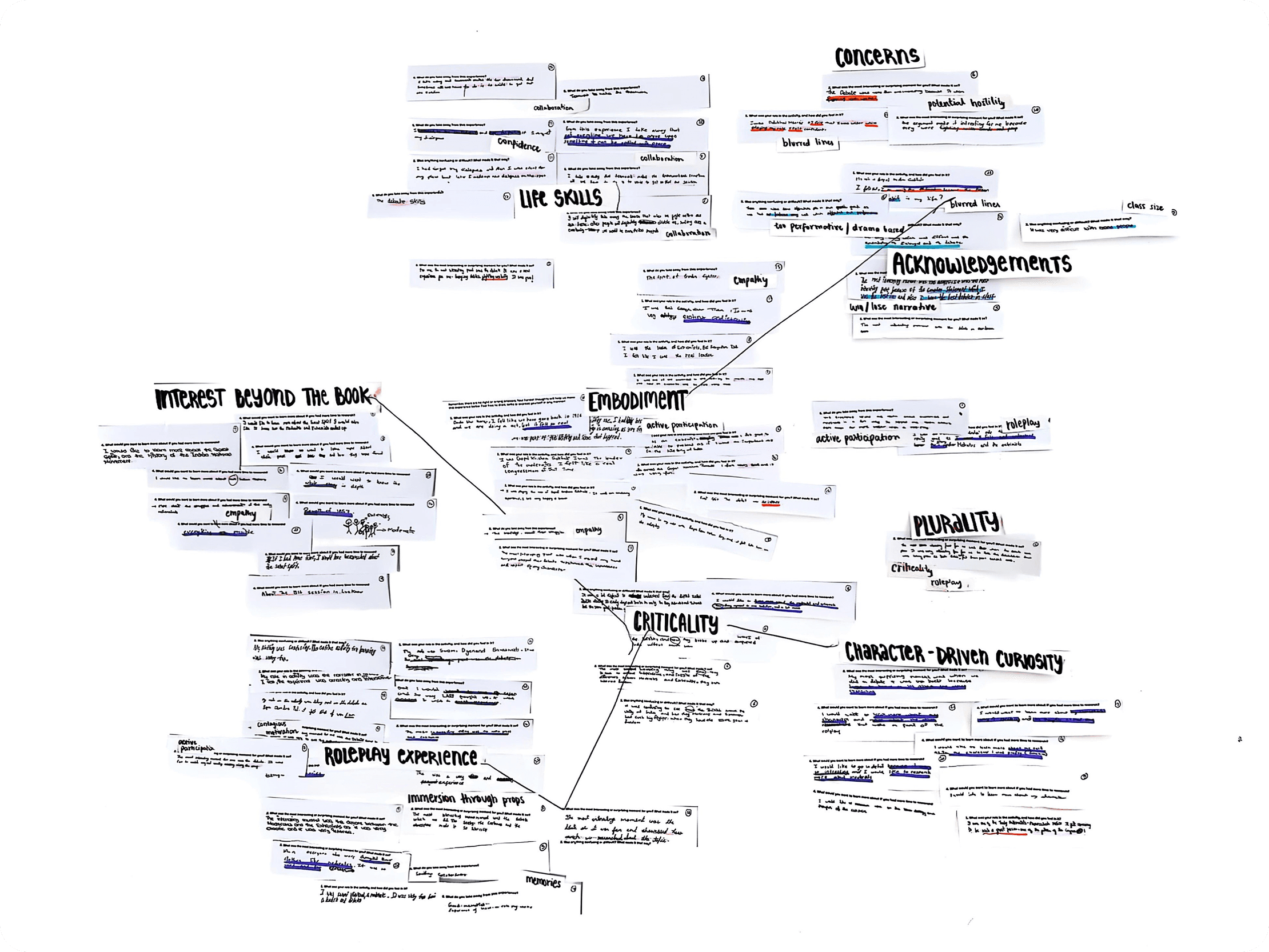 Of course, all this collected data went straight onto the wall. Quotes and cut-outs from transcripts and questionnaires formed the foundation of our analysis. Through thematic identification, patterns began to emerge. Themes such as criticality, empathy, and motivation were surfaced as core insights- and ultimately became our key indicators of impact, revealing the qualitative depth of Un:Scene.
