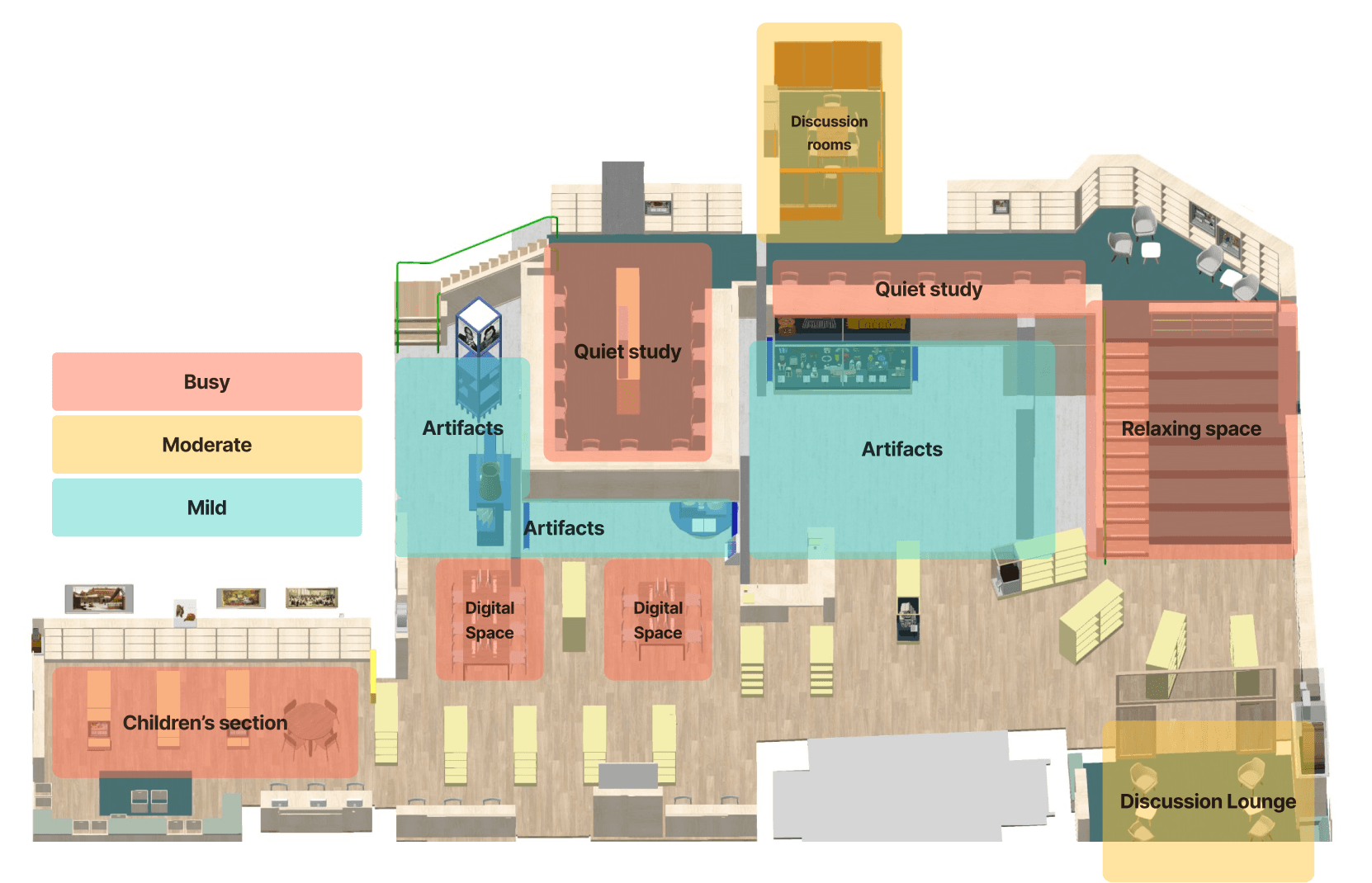 This research framework focused on decoding visitor behaviours, interactions, and underlying needs. Most visitors acted alone, showing greater engagement with staff than with artefacts- pointing to a preference for human connection over static display. The environment was often used not just for learning, but as a personal refuge. These insights highlighted the emotional functions of the space, beyond its intended educational role.